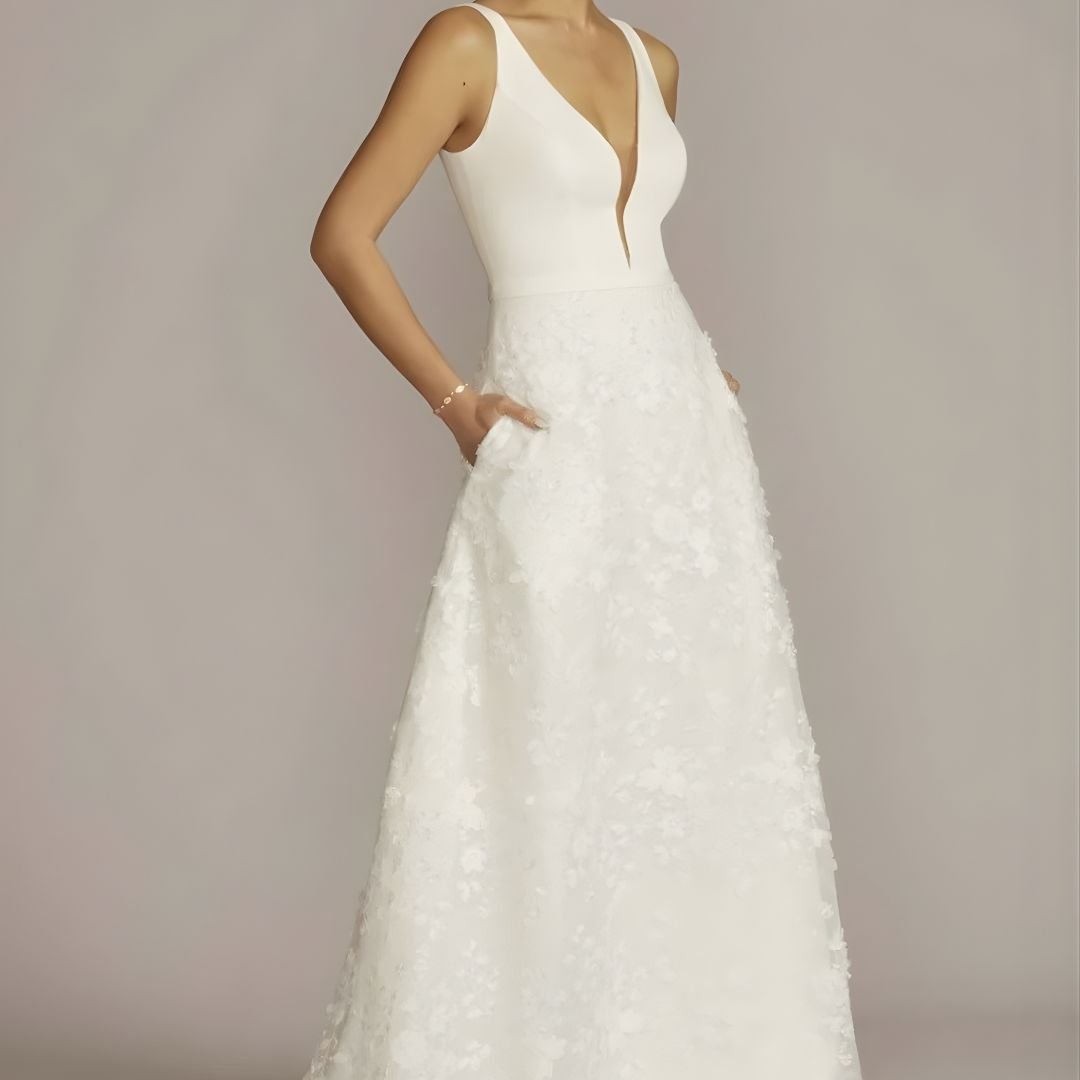 Celebrate your special day in effortless elegance with this 3D Floral Crepe A-Line Wedding Dress with Pockets. Designed for the modern bride, this gown features delicate three-dimensional floral appliqués that add soft texture and romantic detail. The flattering A-line silhouette flows gracefully, while hidden pockets bring practical convenience without compromising style. Perfect for ceremonies, receptions, or outdoor weddings, this dress blends beauty and comfort seamlessly.