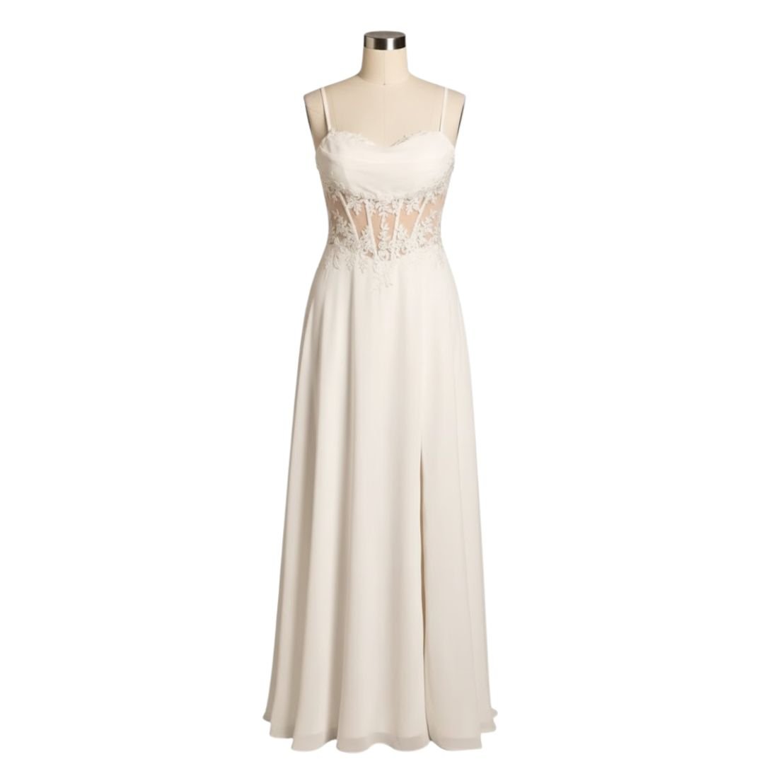 A-line silhouette, illusion lace bodice, floor-length chiffon skirt, back zip closure. Fabric: Chiffon and lace with soft inner lining. Care: Professional dry clean recommended.